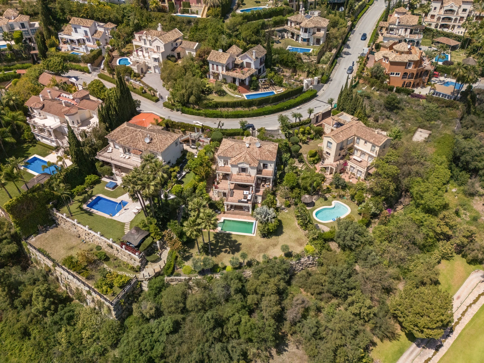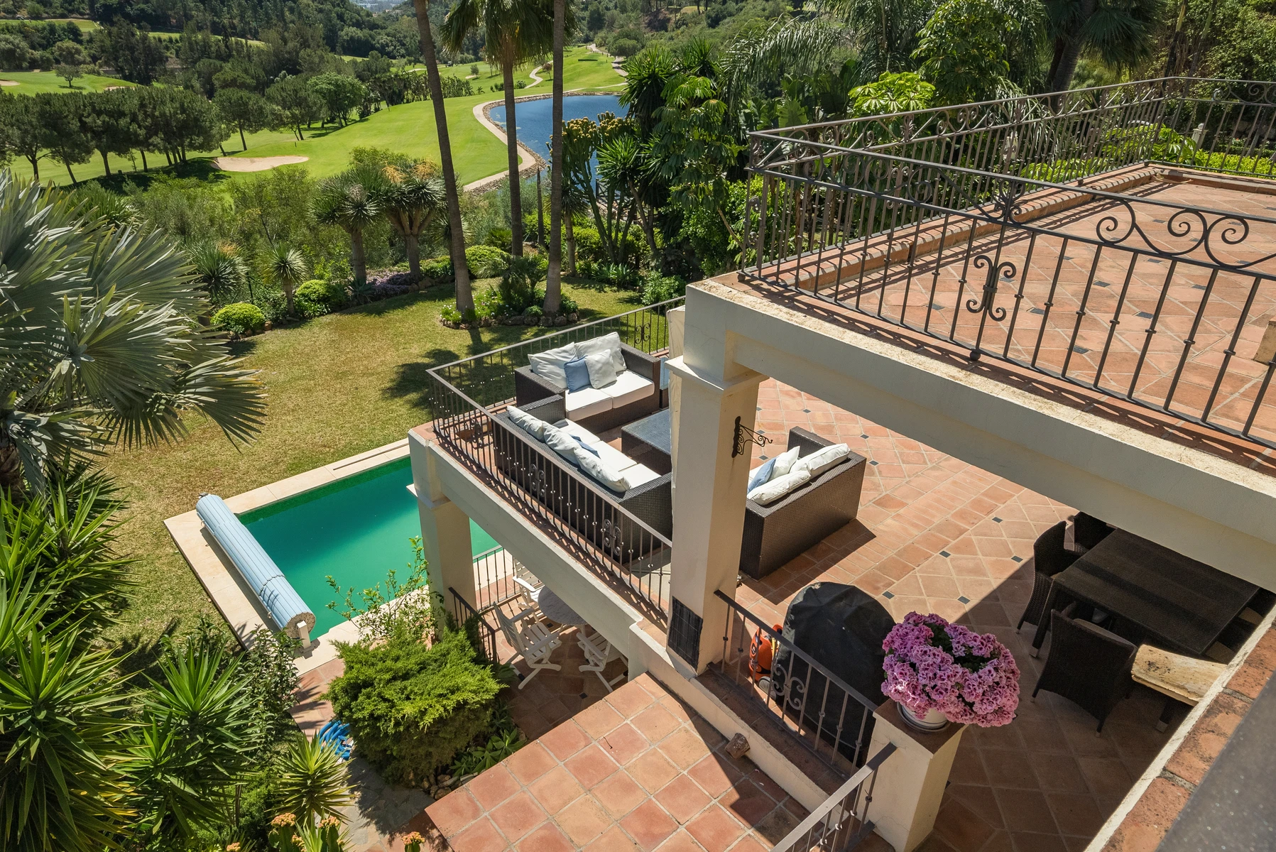 On the lower level, the villa offers two more bedrooms, providing privacy and tranquility. These rooms have direct access to the garden and pool where you can enjoy lush landscaping