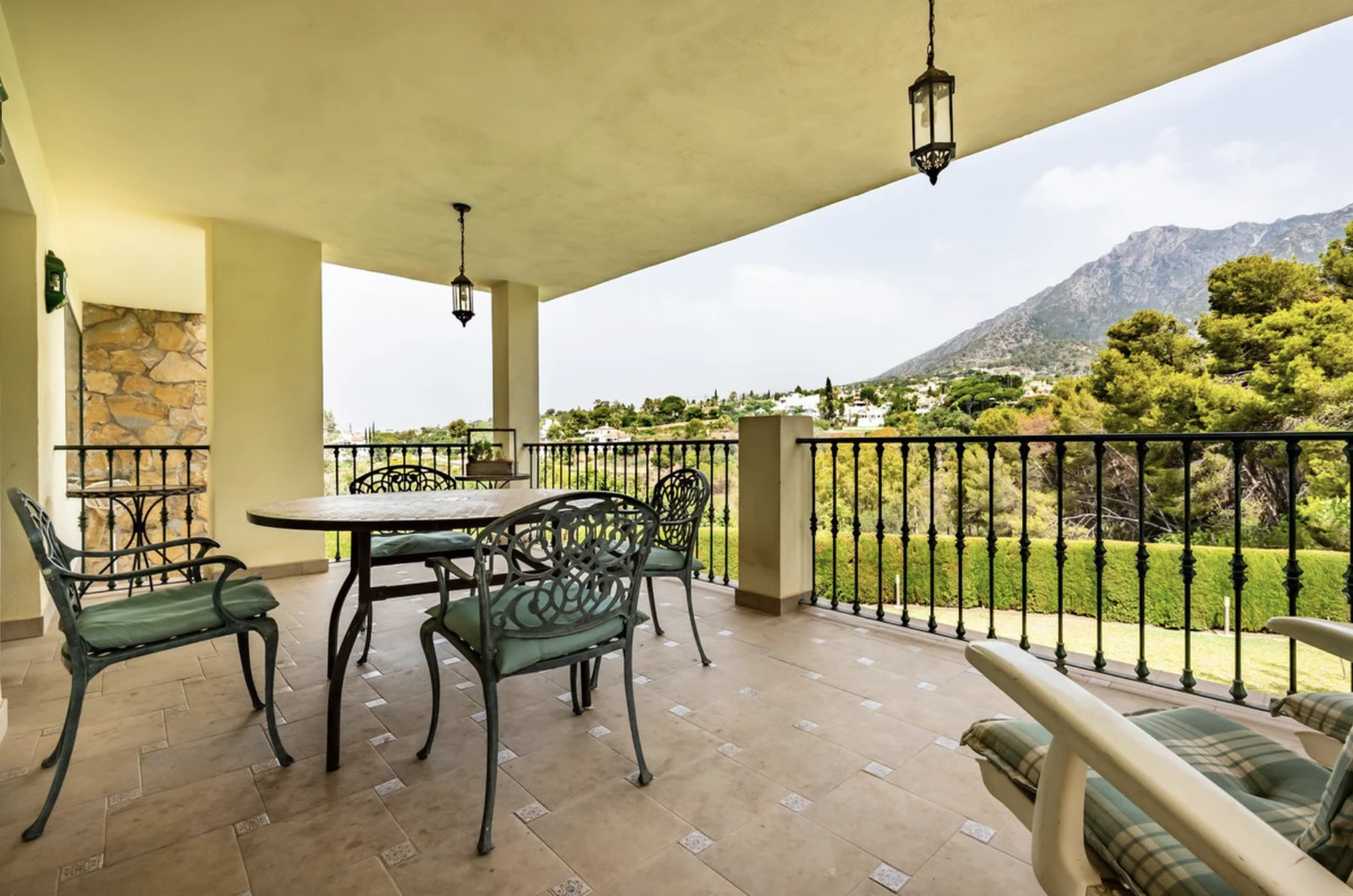 The living room is equipped with hot/cold air conditioning and underfloor heating throughout the house, except for the lower level. On the upper floor, you’ll find three generously sized bedrooms, with the master bedroom offering an en-suite bathroom and dressing room. Another bedroom features a stunning high beamed ceiling. The top floor also includes a terrace with spectacular views and a large chill-out area, perfect for relaxation.