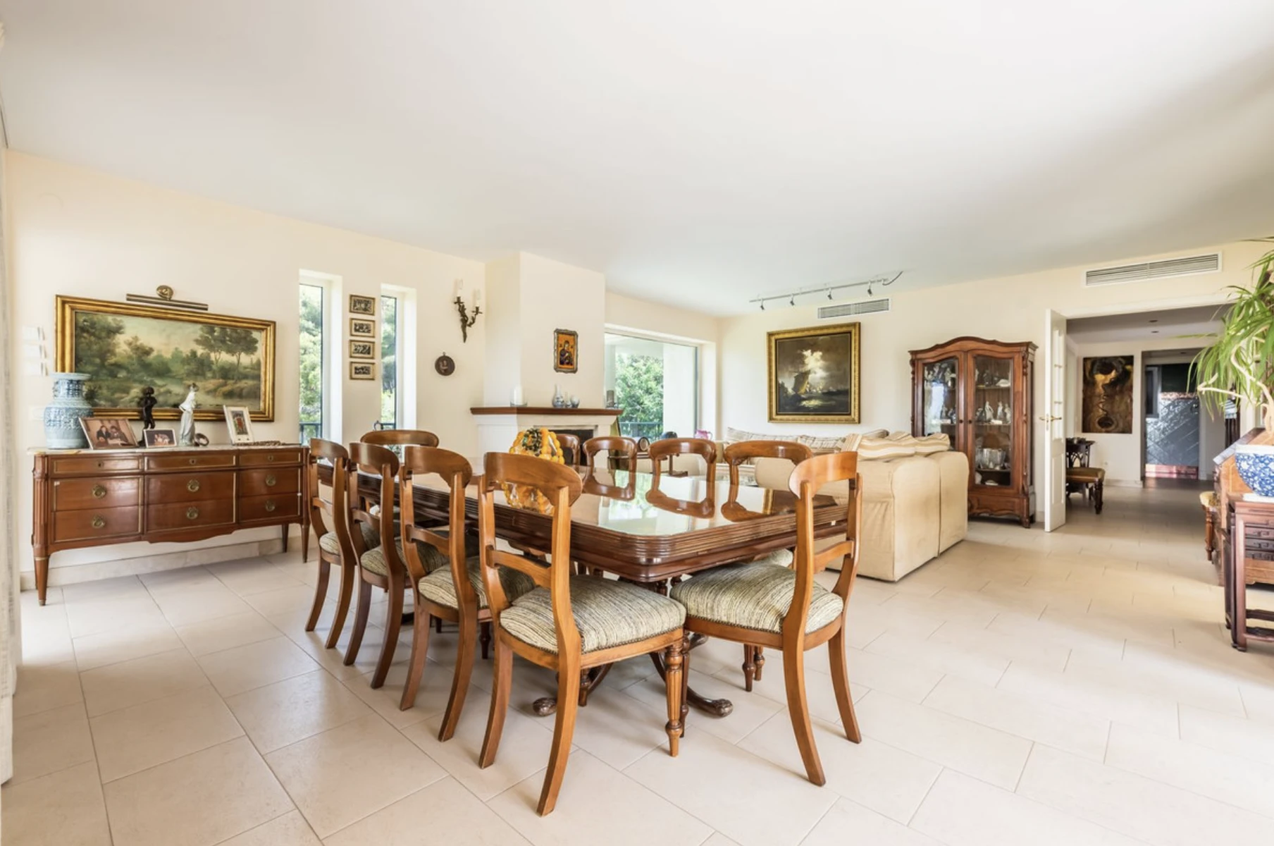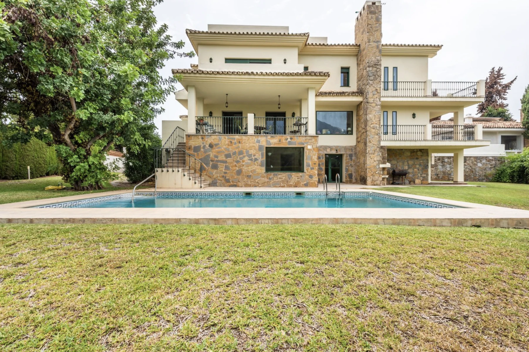 This elegant house is situated in a very central urbanization, fully fenced and featuring a stately outdoor parking area. The home spans three floors, starting with a grand entrance hall that leads to a spacious family kitchen, a guest toilet, and a living room with a cozy fireplace. The dining room, surrounded by beautiful stained glass windows, opens up to a terrace that provides access to the expansive garden and pool area.